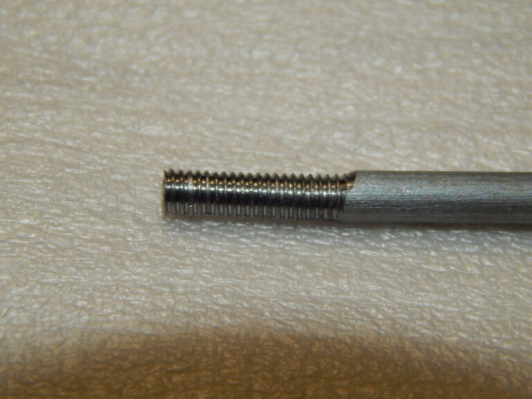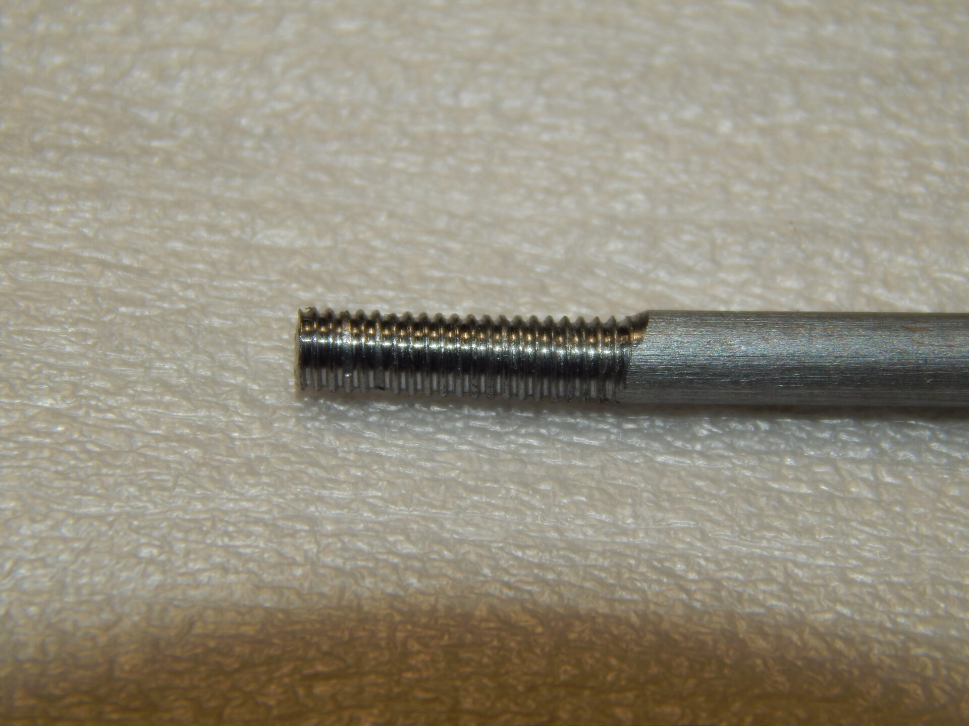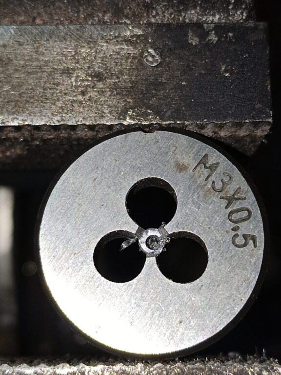 Нарезаем электрод на куски нужной длины, снимаем фаску, и режем резьбу. Поскольку режем мы её китайской леркой из набора, купленного мной в далёком 2009-м году, когда я был совсем нищим, то резьба режется криво, и уже второй пруток обламывается, застревая в лерке, а при попытке его высверлить — в нём обламывается тонкое сверло, приводя меня в бешенство.