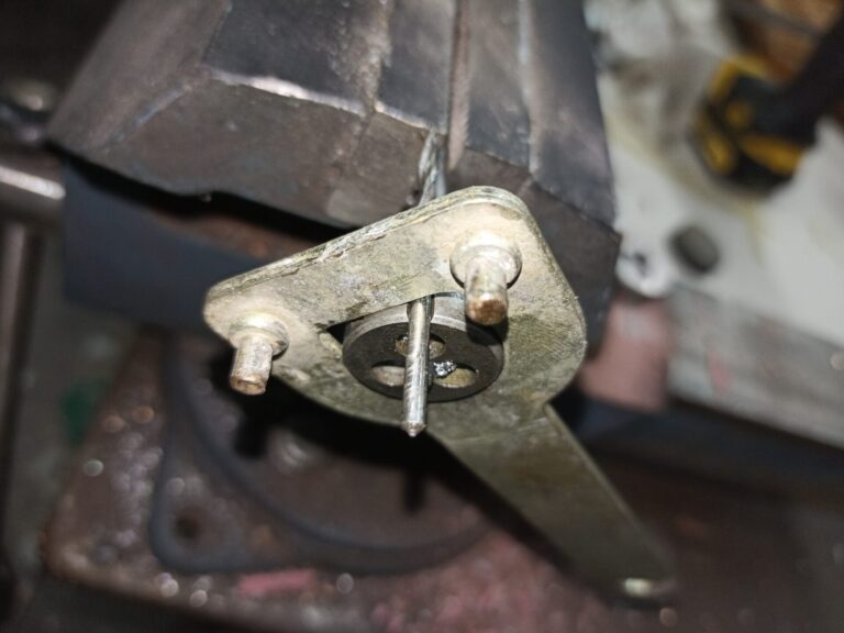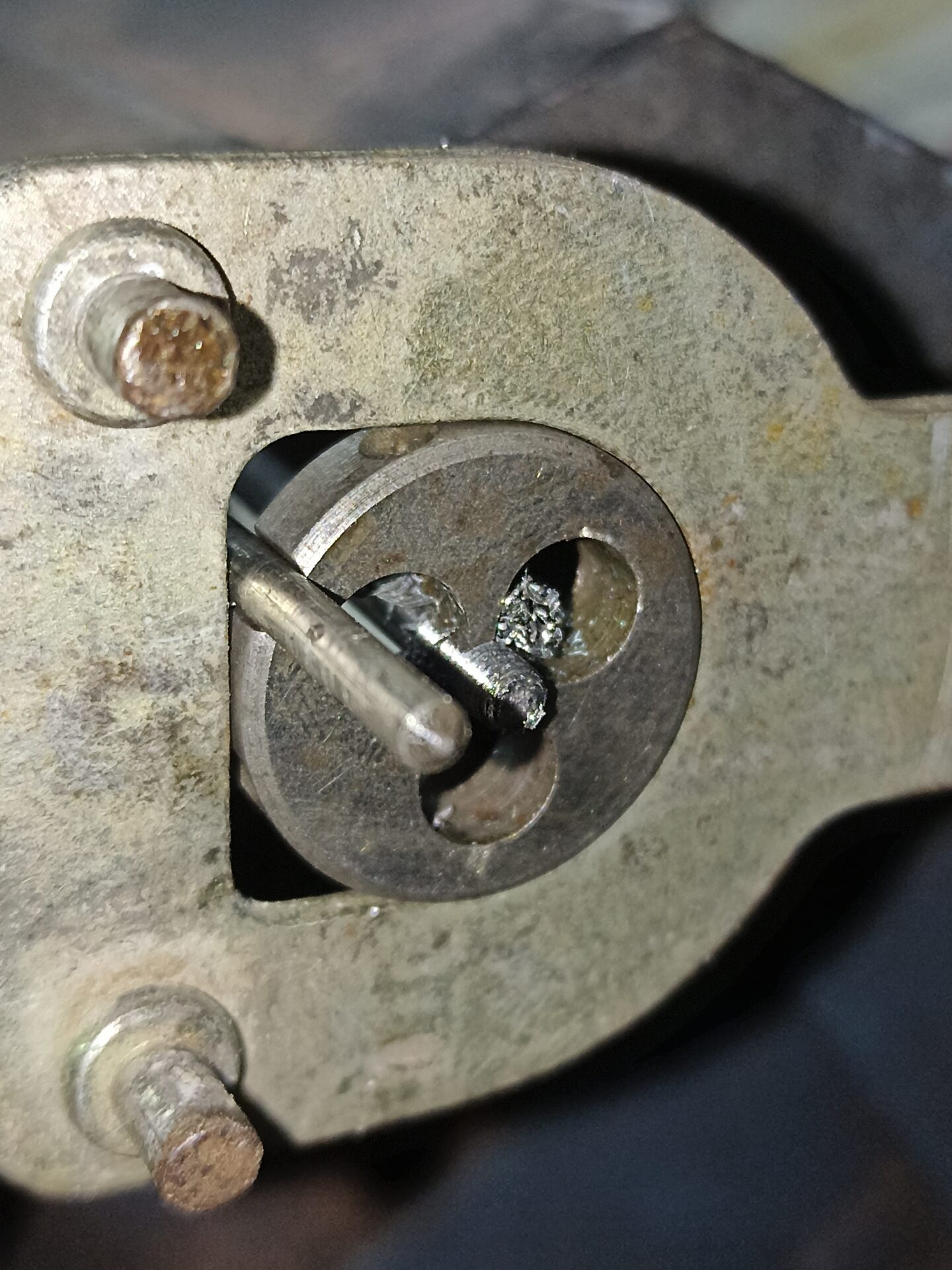 Но не беда! У нас в запасе есть советская лерка! Правда, её нечем крутить, т.к. она мелкого диаметра, но выход тут же нашёлся — она идеально подошла по диаметру к скруглению отверстия ключа для болгарки! А стопорилась в нём вставкой подходящего диаметра сверла в паз!