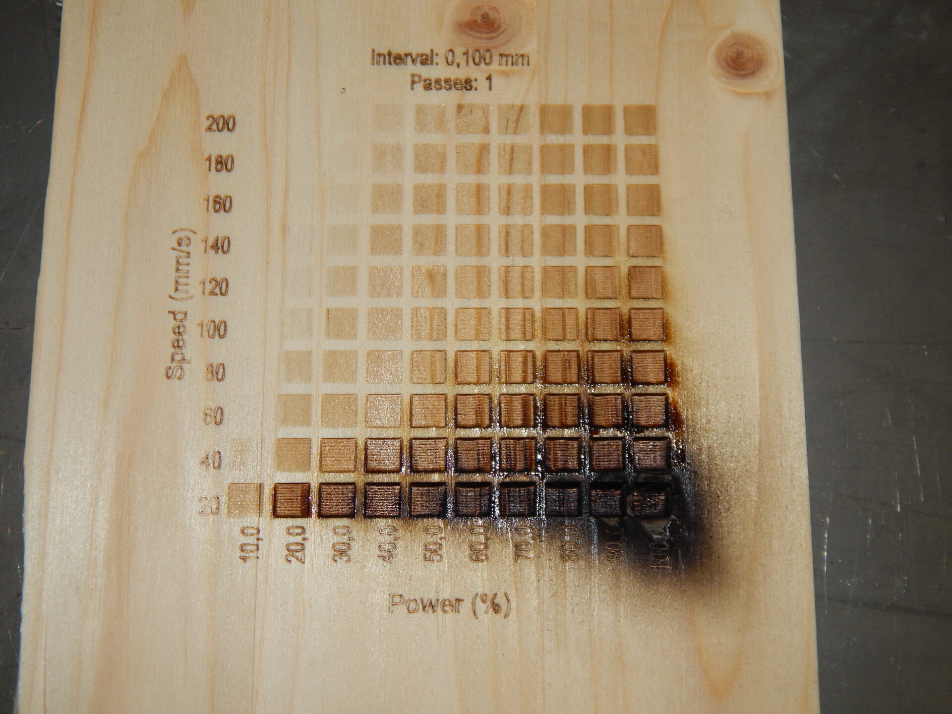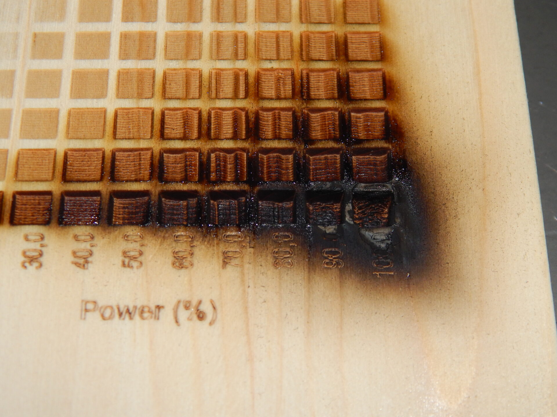 Однако вместо образования чётного градиента яркости, лазер просто увеличивал глубину гравировки, а на высоких мощностях — начинал прожигать дерево, достигая максимальной глубины около 5мм.