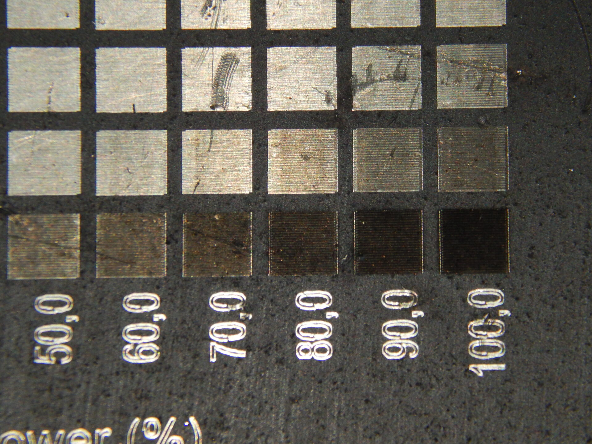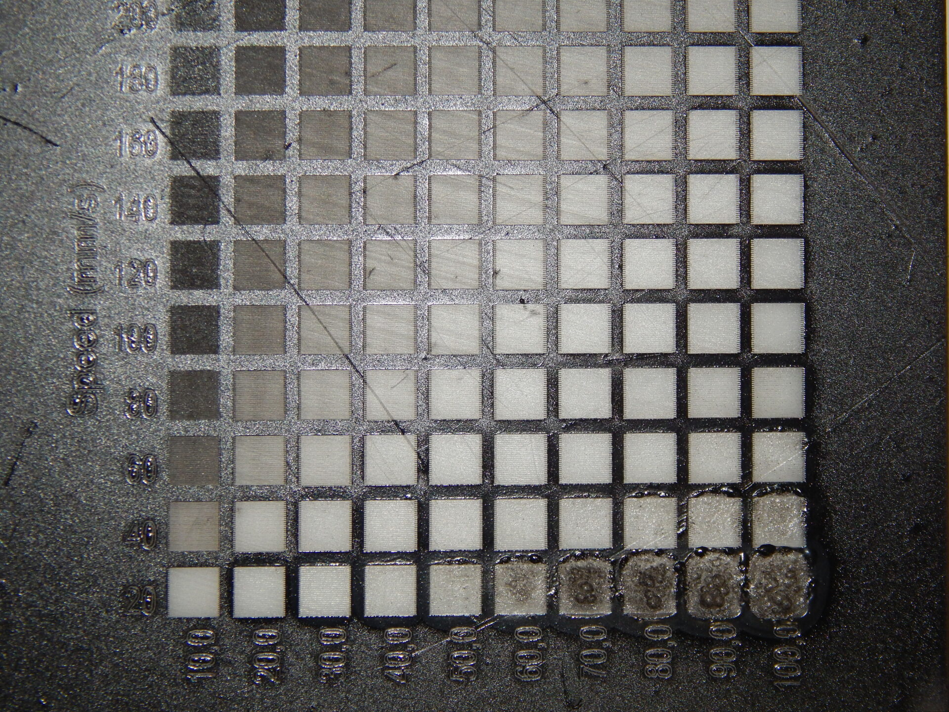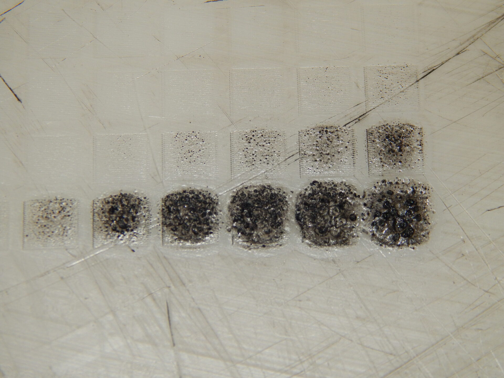 Интересен и эффект образования градиента окраски не только в области с высокой скоростью и низкой мощностью, но и в области с низкой скоростью и высокой мощностью. Как выяснилось, при росте мощности и времени экспозиции, копоть от выжигаемой краски не сдувается с поверхности, а снова вжигается в неё лазерным лучом.