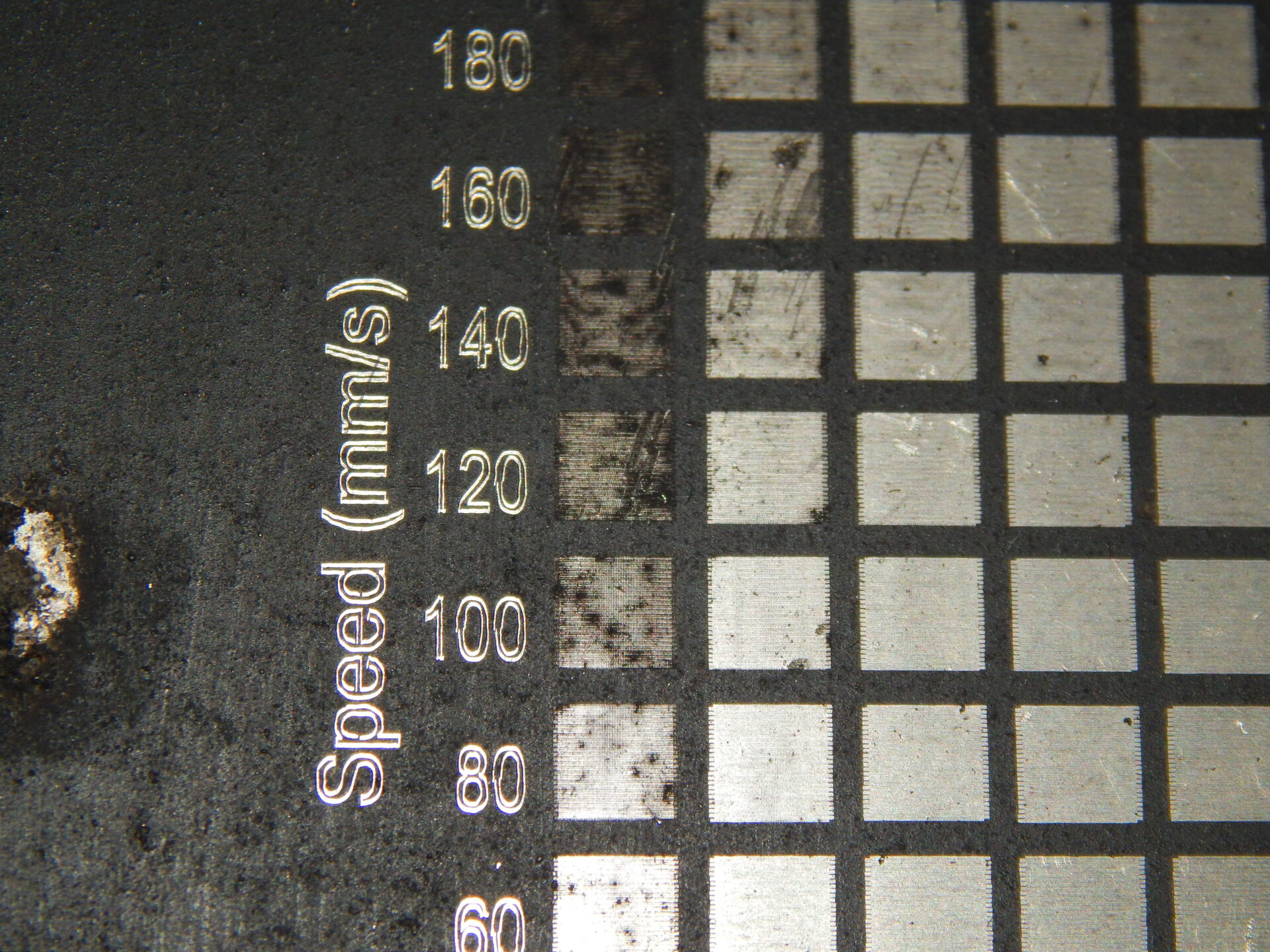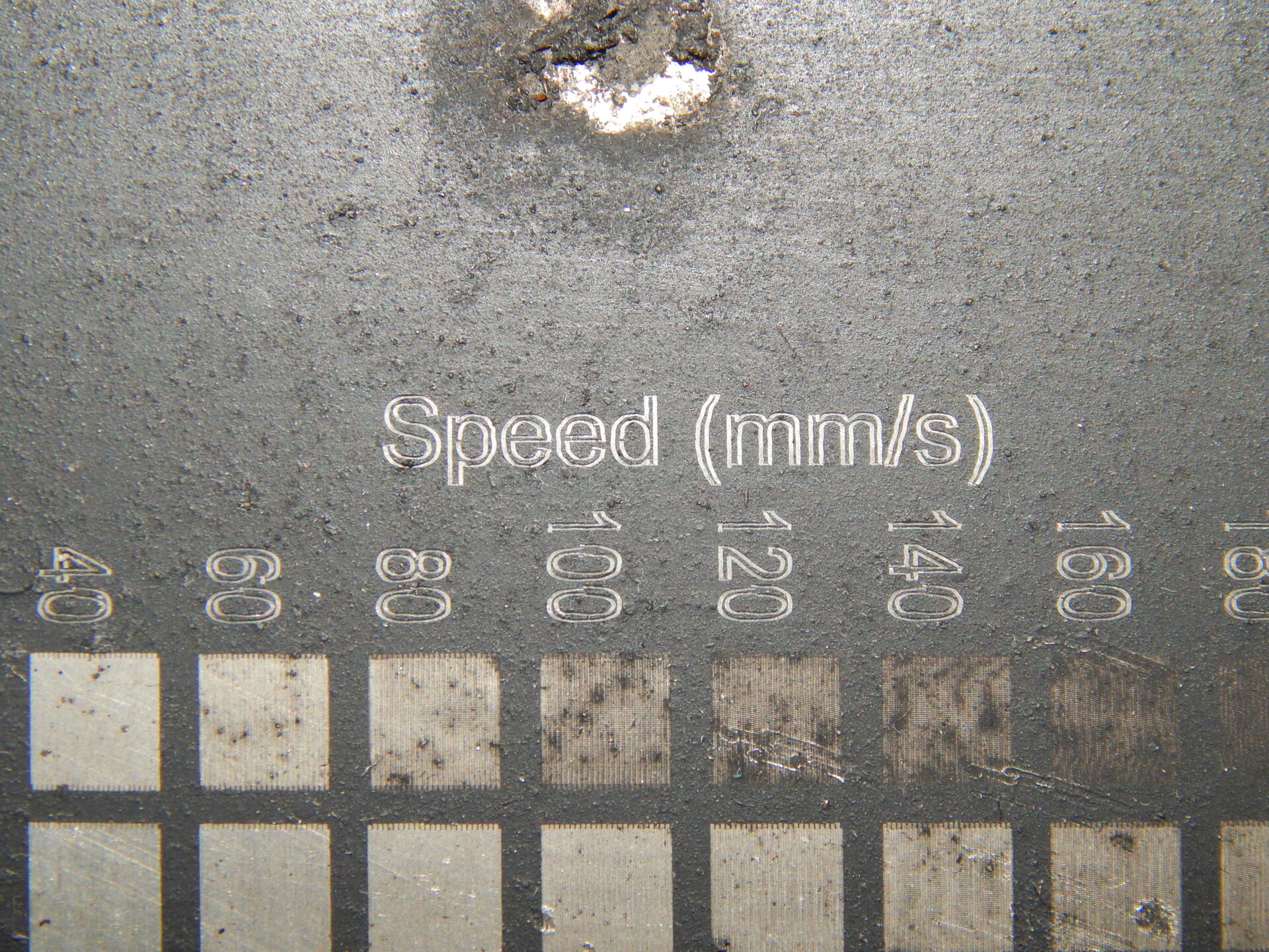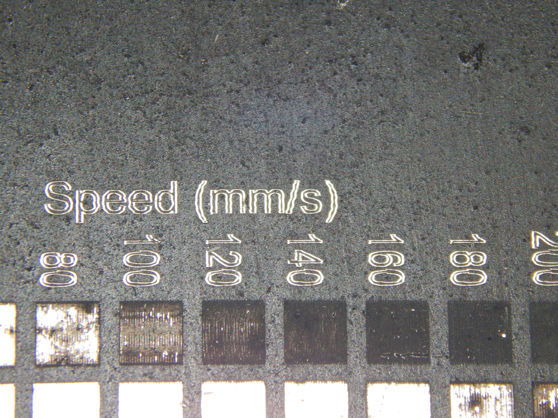 Интересен и эффект образования градиента окраски не только в области с высокой скоростью и низкой мощностью, но и в области с низкой скоростью и высокой мощностью. Как выяснилось, при росте мощности и времени экспозиции, копоть от выжигаемой краски не сдувается с поверхности, а снова вжигается в неё лазерным лучом.
