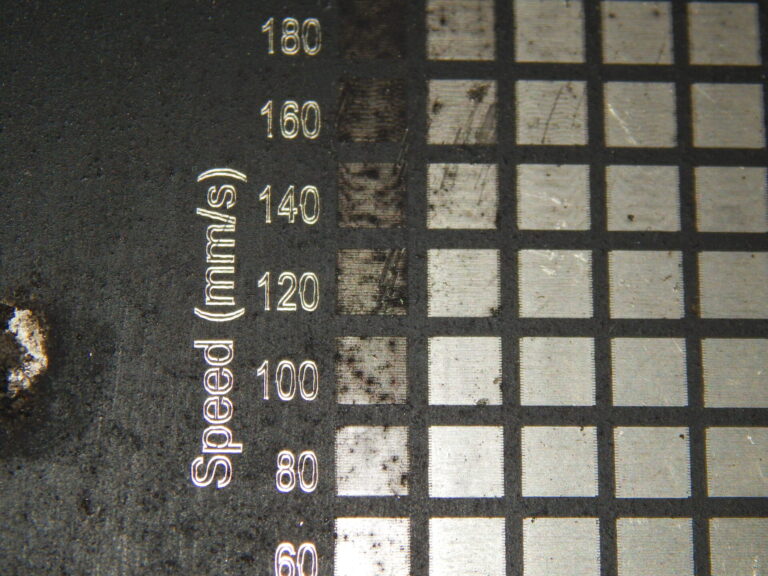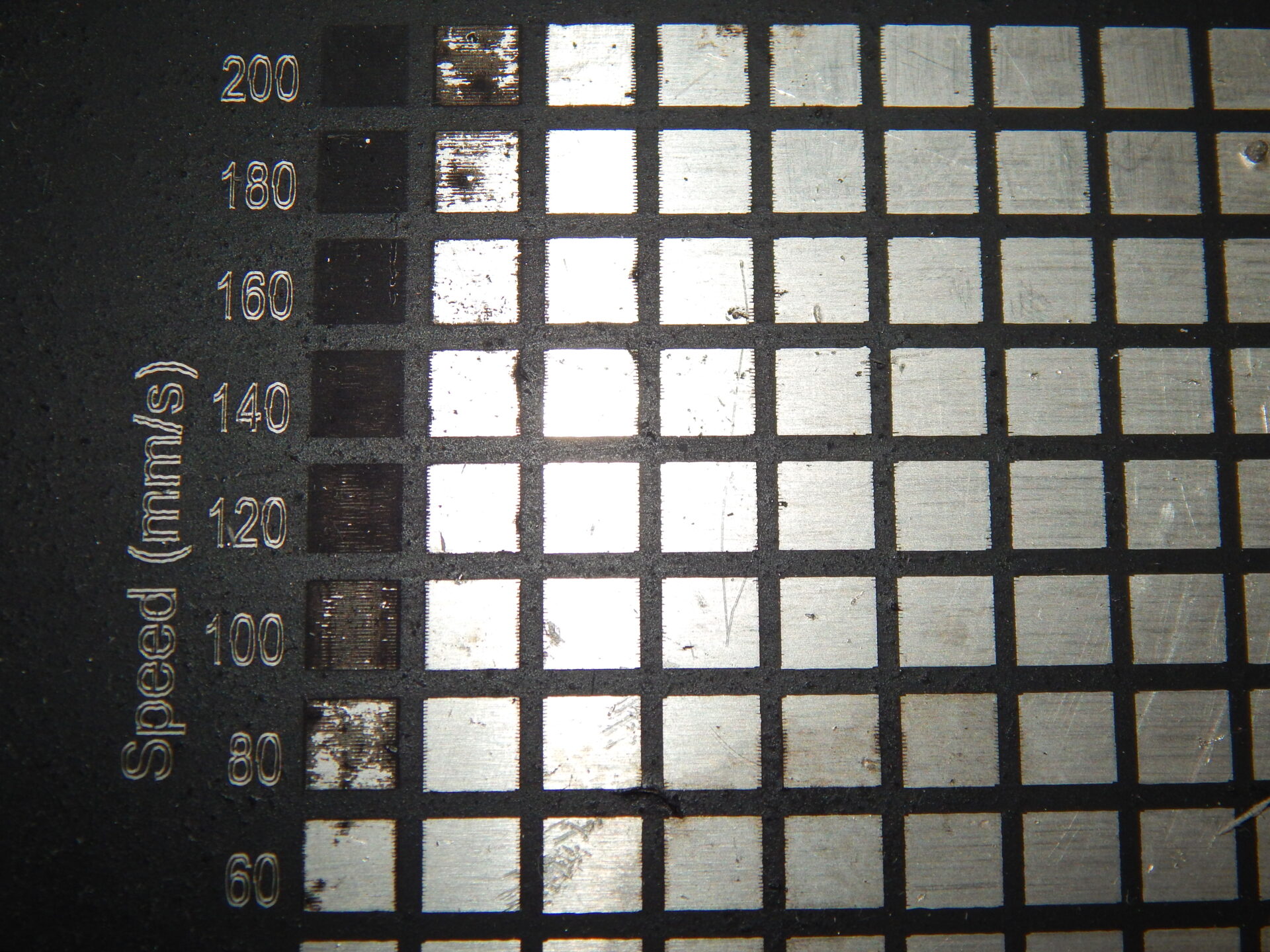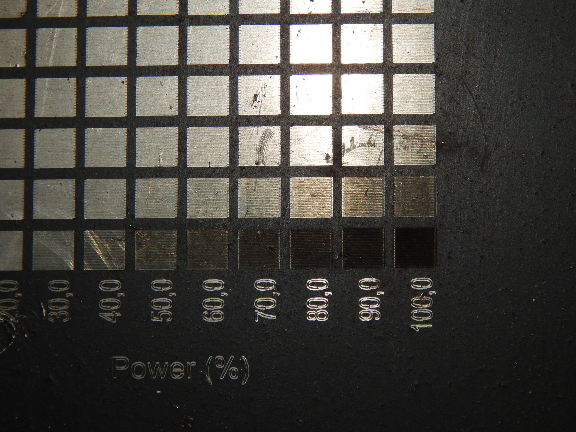 Для теста используем стандартный тест мощности, предлагаемый нам LightBurn. Гравируем по слою чёрной акриловой краски, нанесённому на грязную дюралюминиевую пластину, валявшуюся у меня в гараже.