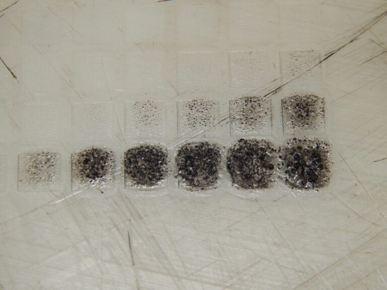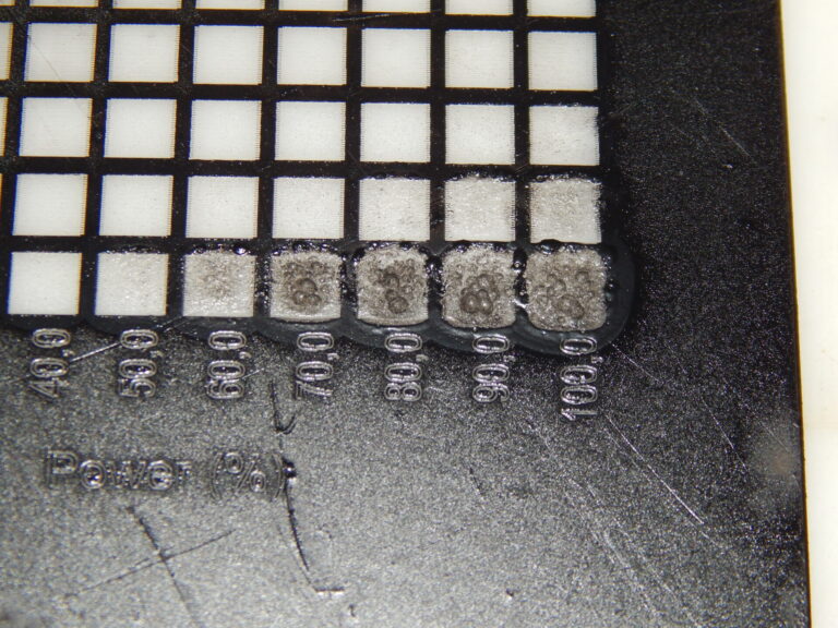 На ней так же чётко виден сформировавшийся градиент, отсутствие вибраций, и треки лазерного пятна, однако в области максимальной мощности и минимальной скорости можно наблюдать вскипание полиэтилена. Эта область совпадает с той, которая на алюминиевой пластине соответствует вжиганию копоти обратно в поверхность. Только в данном случае, в отличие от алюминия, это приводит к тому, что полиэтилен начинает поглощать лазерный луч, и кипеть.