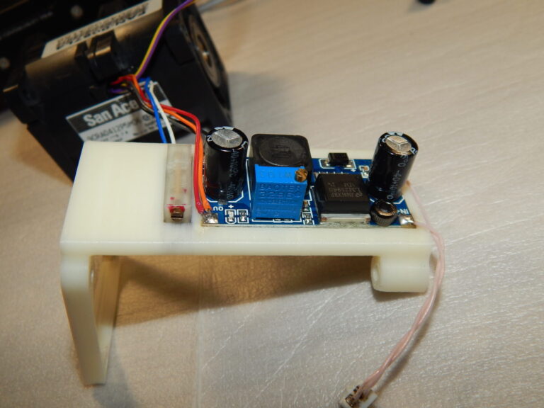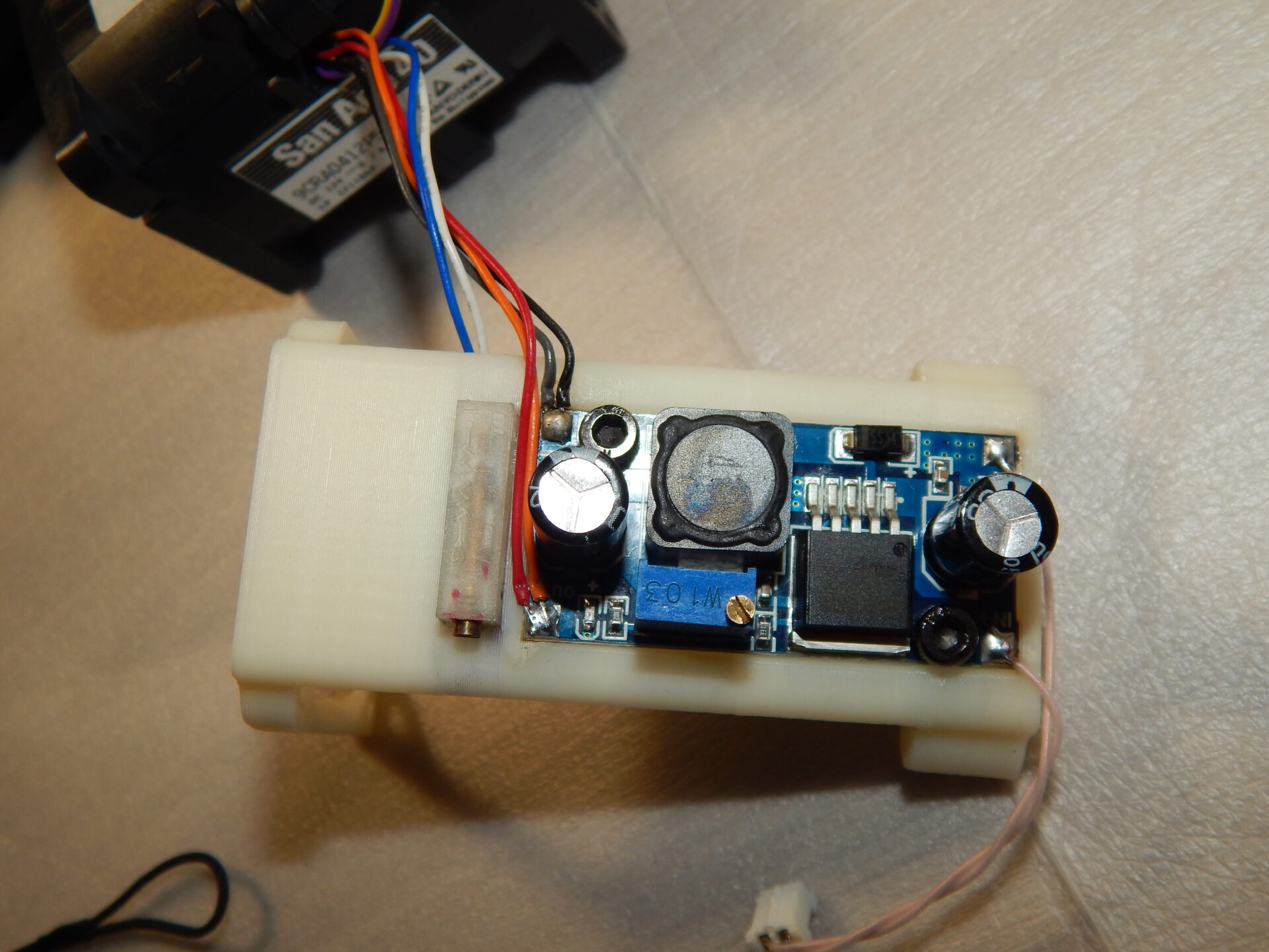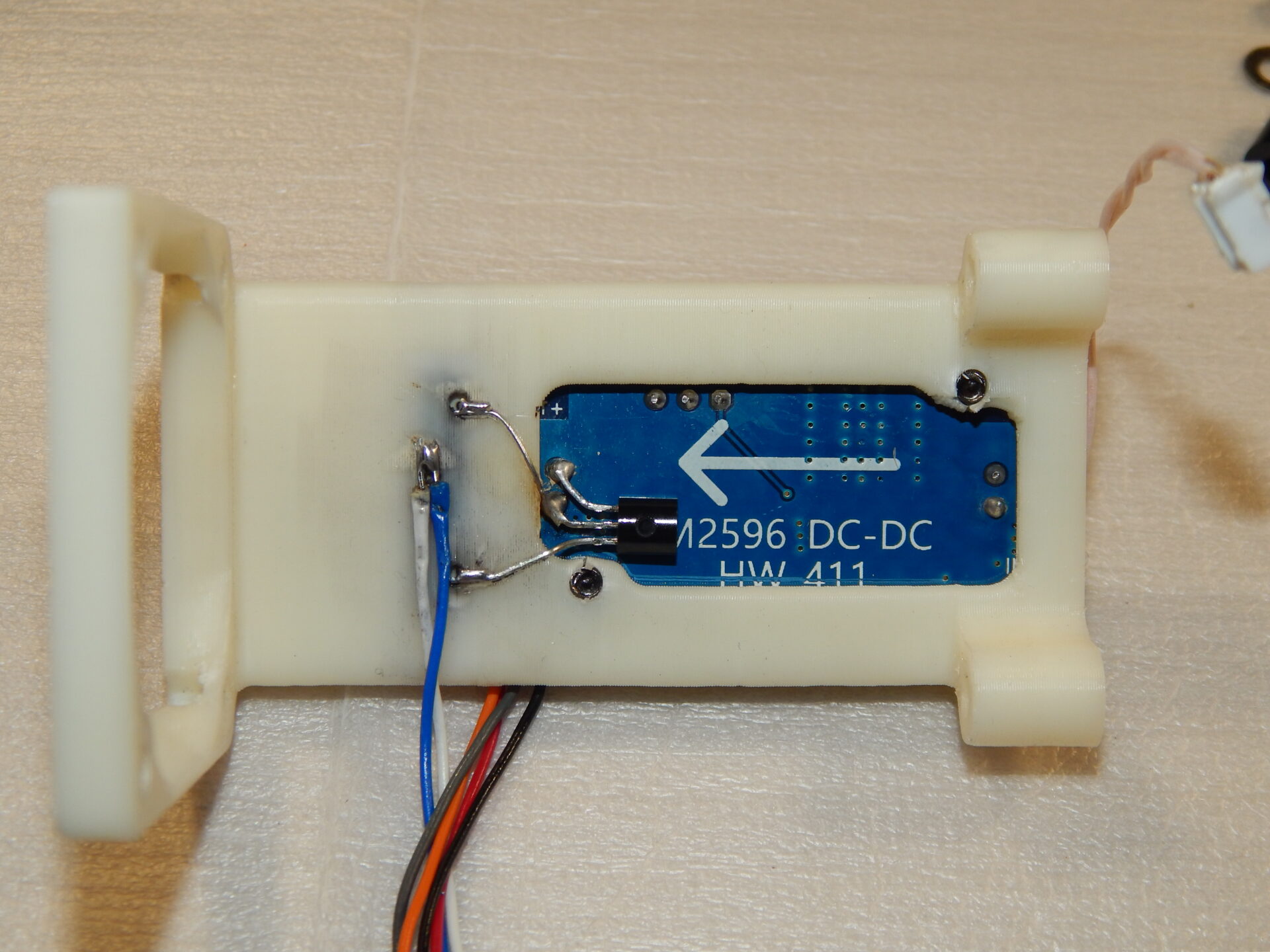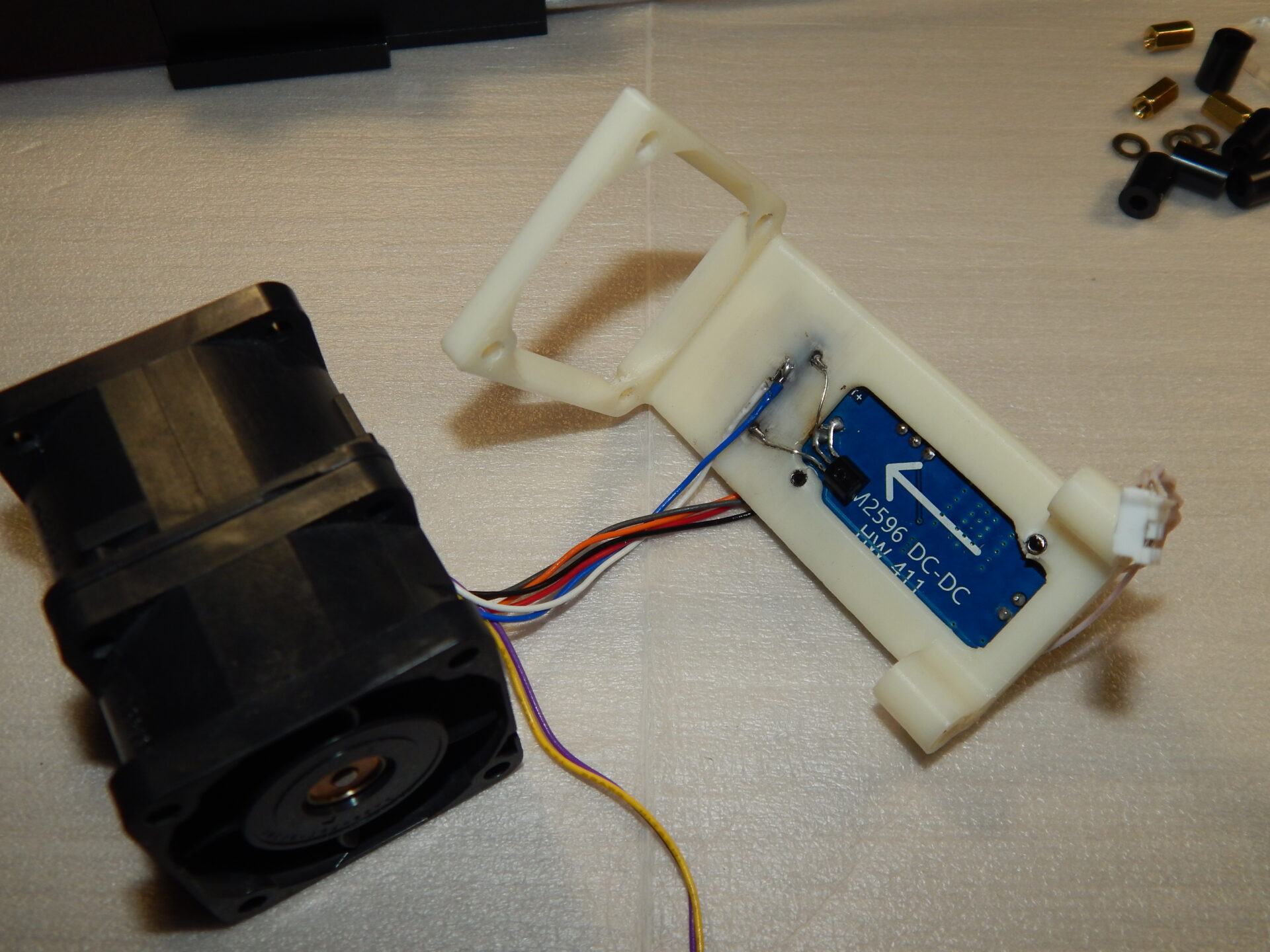 Но вот кронштейн напечатан, к нему прикручен преобразователь питания, к выходу которого подпаян не только вентилятор, но и стабилизатор 78L05, о назначении которого будет отдельно сказано ниже.