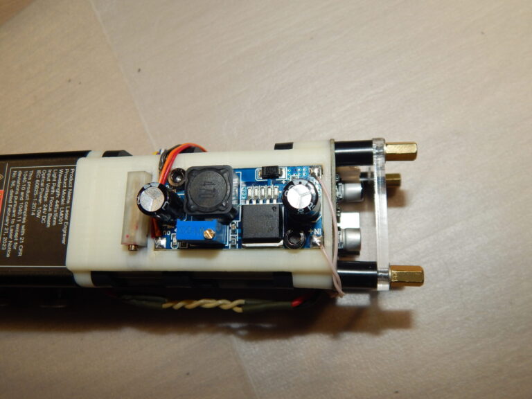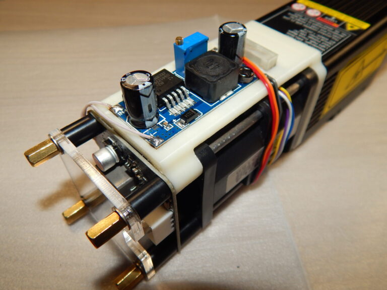 Конечно, мы можем регулировать обороты простым изменением выходного напряжения DC-DC преобразователя, но при низком напряжении есть риск, что вентилятор просто не запустится, а при данном включении — контроллер запускает крыльчатки коротким импульсом, а затем поддерживает заданные резистором обороты. Так же пришлось удлинить немного провода питания лазера. Схему я не привожу — она примитивна и интуитивно понятна.