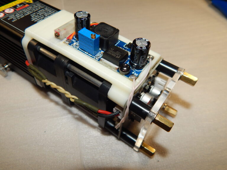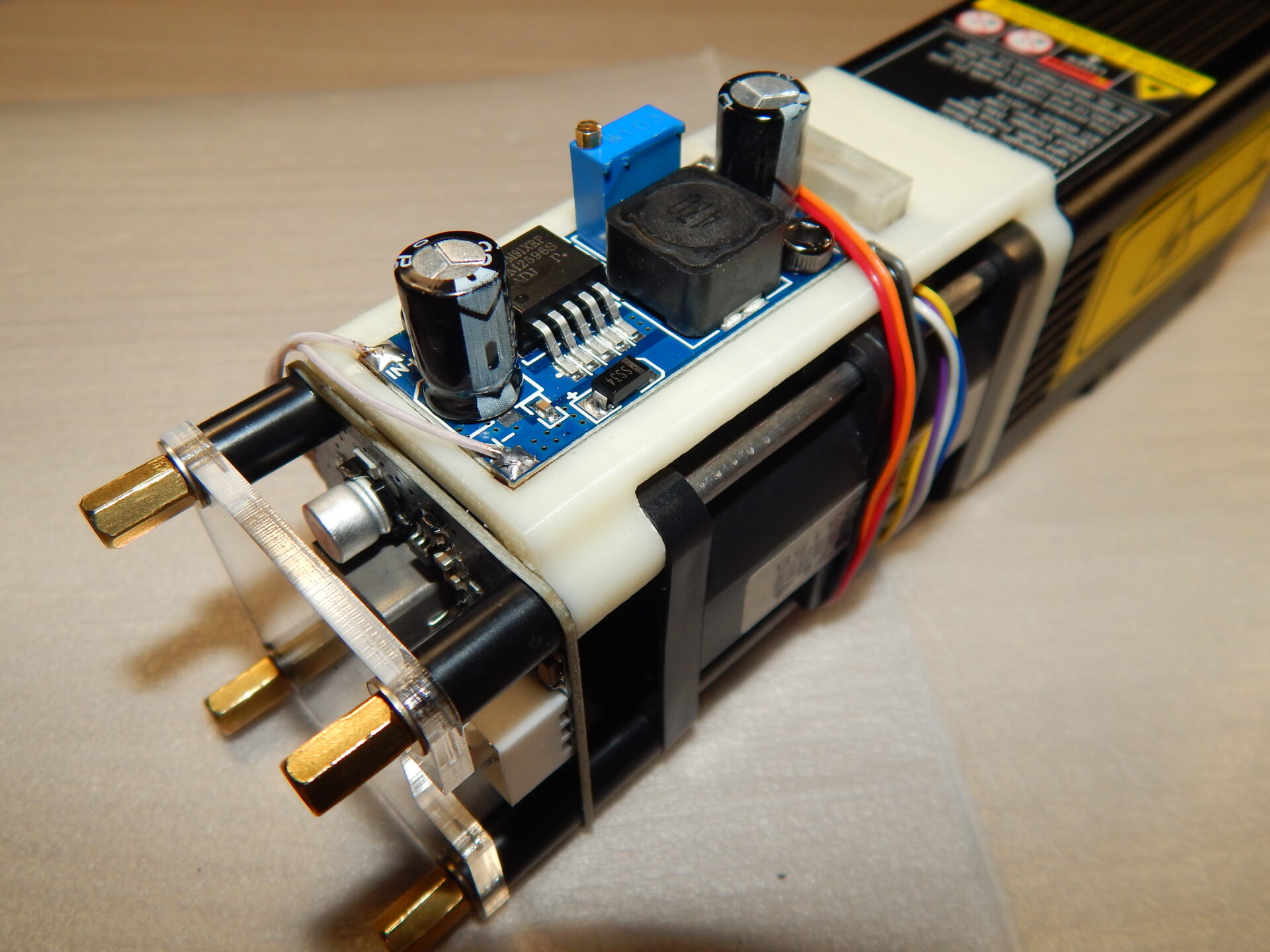 Однако, у меня в наличии были вентиляторы San Ace 40 от Sanyo Denki! Бонус — это реально качественные, и хорошо сбалансированные вентиляторы, объединённые в блок из двух встречно вращающихся вентиляторов, что обеспечивает ламинарный поток, и отсутствие гироскопического эффекта. Из минусов — вентиляторы на 12 вольт, а значит, надо придумать, как понизить напряжение, желательно сохранив КПД. И в этом нам помогут step-down импульсные DC-DC преобразователи HW-411, на базе проверенных временем микросхем LM2596. Осталось только придумать, как их крепко прицепить к лазерной голове.